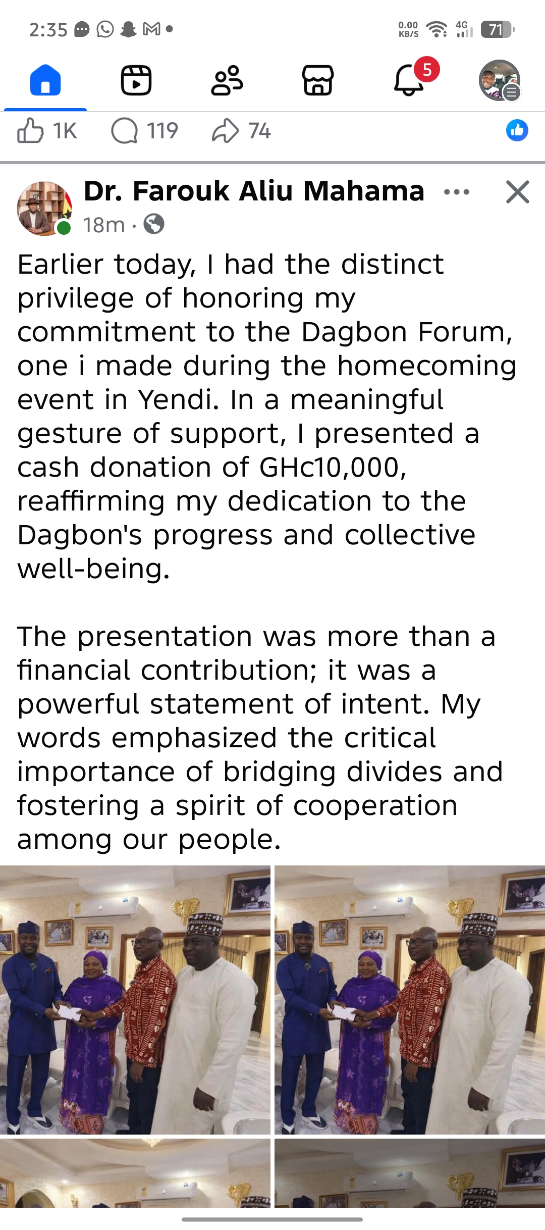 “Earlier today, I had the distinct privilege of honoring my commitment to the Dagbon Forum, one i made during the homecoming event in Yendi. In a meaningful gesture of support, I presented a cash donation of GHc10,000, reaffirming my dedication to the Dagbon’s progress and collective well-being’. He posted on his Facebook wall