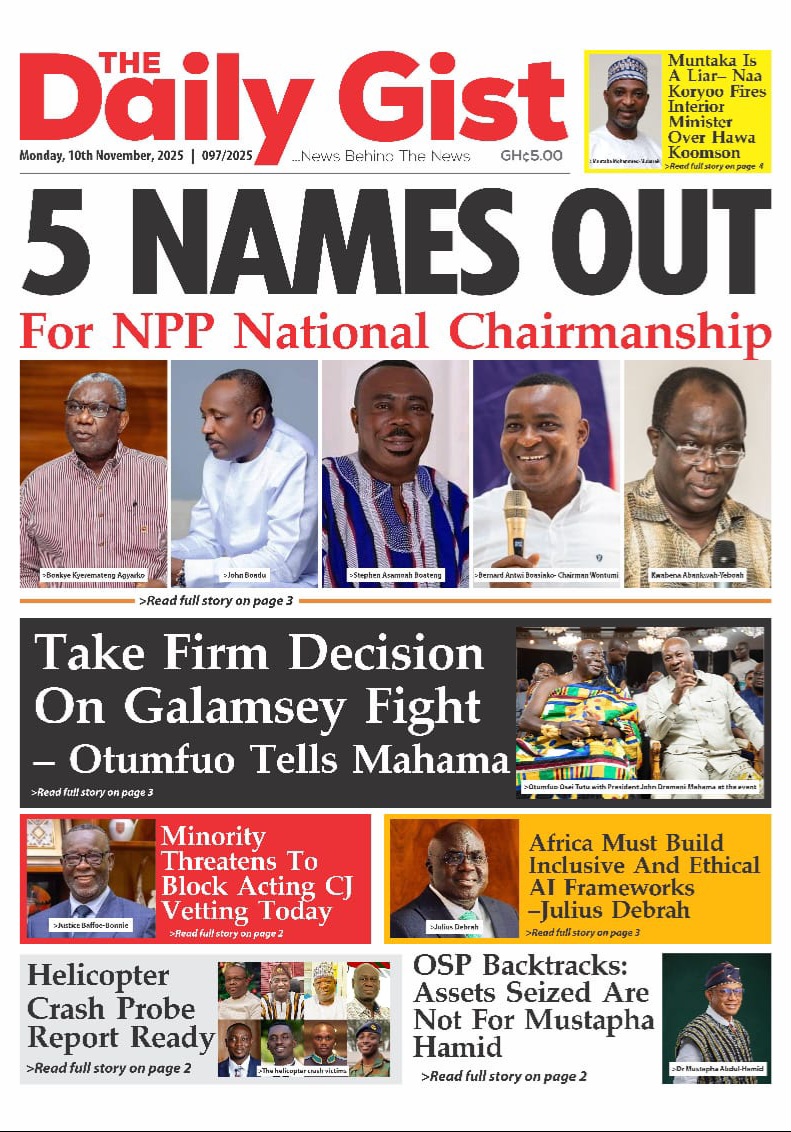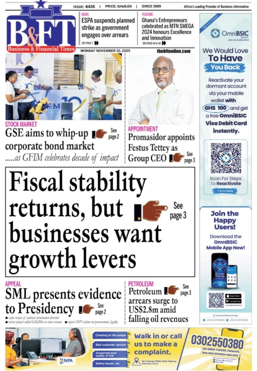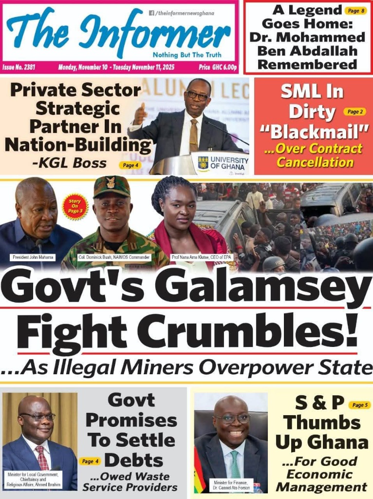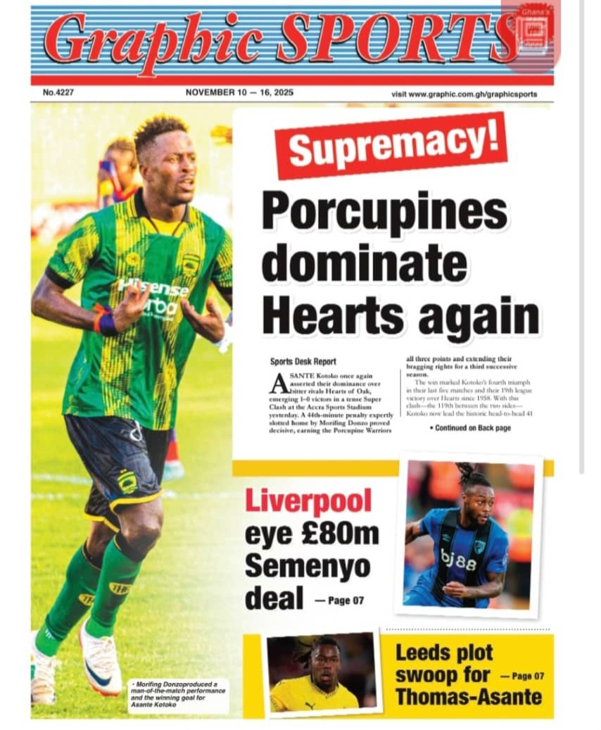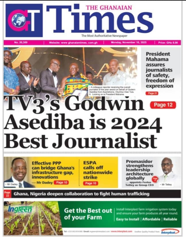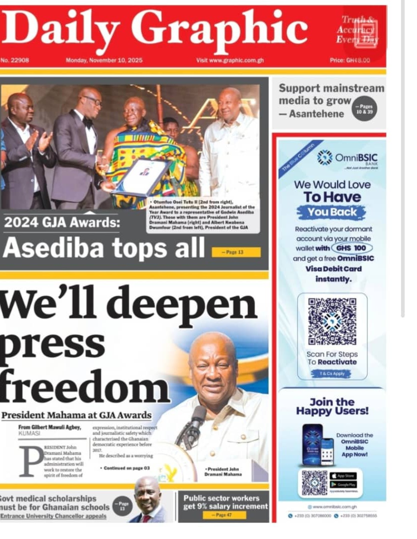 NEWS Monday November 10 2025 Newspaper Headlines By Tolon Radio November 10, 2025 Share Monday November 10 2025 Newspaper Headlines SHARE Monday November 10 2025 Newspaper Headlines By: Hamza Lansah Lolly You Might Also Like New passport application fee reduced to GHS350 — Effective November 13 Govt, Labour Unions reach agreement: 9% salary increment President Mahama to launch “Nkoko Nkitinkiti” program in Kumasi August 6 Helicopter tragedy report to be presented to National Security Council tomorrow Northern Regional Minister Commissions TCDA Tamale Office to Boost Shea and Cashew Production Share This Article Facebook Twitter Email Print Follow USFind US on Social Medias FacebookLikeTwitterFollowInstagramFollowYoutubeSubscribe Popular News BUSINESS ‘Was Mahama on Mars?’ – Former Finance Minister rejects economic crisis claims Tolon Radio February 7, 2025 We don’t recycle failure in elections – Ken Agyapong warns NPP Women MPs visit AMA, Makola Market; pledge strong support for Market Women. Monday October 20 2025 Newspaper Headlines Ibrahim Mahama pays $25k for kidney transplant to save 13-year-old girl TRENDING Monday November 10 2025 Newspaper Headlines November 10, 2025 New passport application fee reduced to GHS350 — Effective November 13 November 9, 2025 Govt, Labour Unions reach agreement: 9% salary increment November 9, 2025 President Mahama to launch “Nkoko Nkitinkiti” program in Kumasi November 9, 2025 August 6 Helicopter tragedy report to be presented to National Security Council tomorrow November 9, 2025