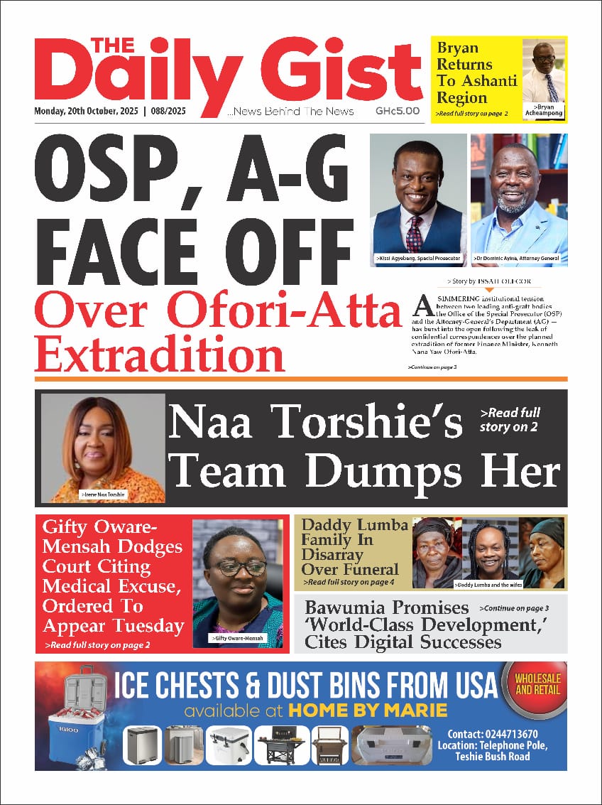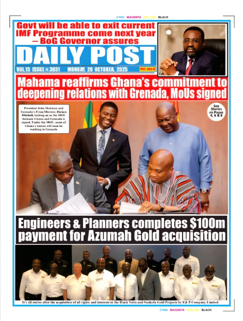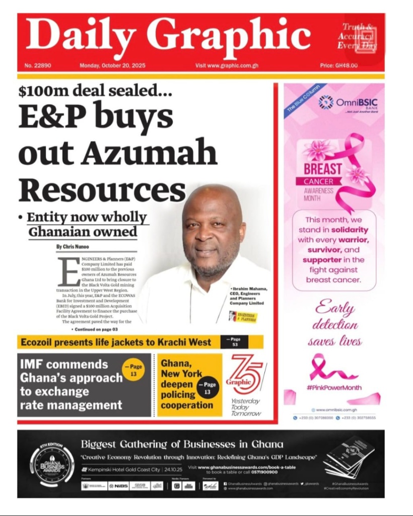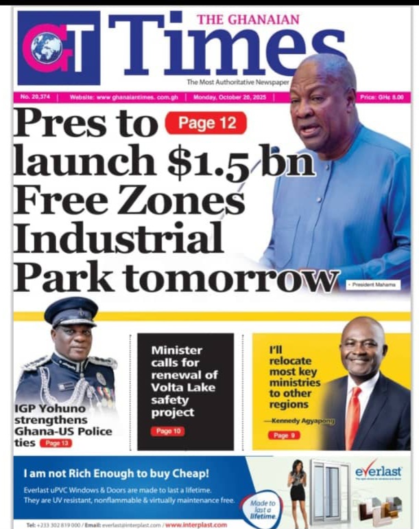 NEWS Monday October 20 2025 Newspaper Headlines By Tolon Radio October 20, 2025 Share Monday October 20 2025 Newspaper Headlines SHARE Monday October 20 2025 Newspaper Headlines You Might Also Like Sene East MP empowers local beauticians and fashion designers Former NEIP CEO Kofi Nkansah rebuts Health Minister’s claim on agenda 111 projects Gov’t extends free SHS to Private Schools — ₵994 annual support per student to benefit 25,000 learners Friday, October 17, 2025 Newspapers Front Pages Minority Caucus holds pre-opening workshop ahead of Parliament’s resumption Share This Article Facebook Twitter Email Print Follow USFind US on Social Medias FacebookLikeTwitterFollowInstagramFollowYoutubeSubscribe Popular News NEWS Dr. Amin Adam champions a quiet education transformation in the North Tolon Radio July 6, 2025 President Mahama inspects Ofankor-Nsawam road project Breaking News: NDC selects Bernard Ahiafor as Deputy Speaker of the 9th Parliament Equatoria Guinea Supreme Cout acquits Balthazar Engonga in high profile scandal Minority Leader debunked quotes in alleged leak Mike Oquaye’s report TRENDING Monday October 20 2025 Newspaper Headlines October 20, 2025 Sene East MP empowers local beauticians and fashion designers October 19, 2025 Samed Gunu champions Bawumia’s Presidential ambitions in Savelugu October 17, 2025 Former NEIP CEO Kofi Nkansah rebuts Health Minister’s claim on agenda 111 projects October 17, 2025 Gov’t extends free SHS to Private Schools — ₵994 annual support per student to benefit 25,000 learners October 17, 2025