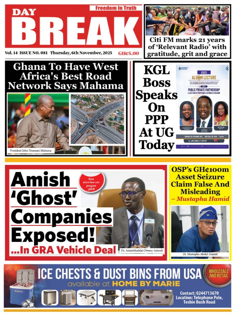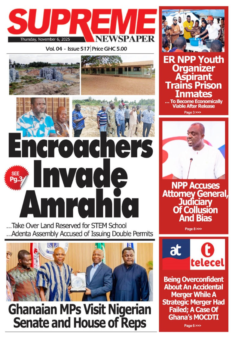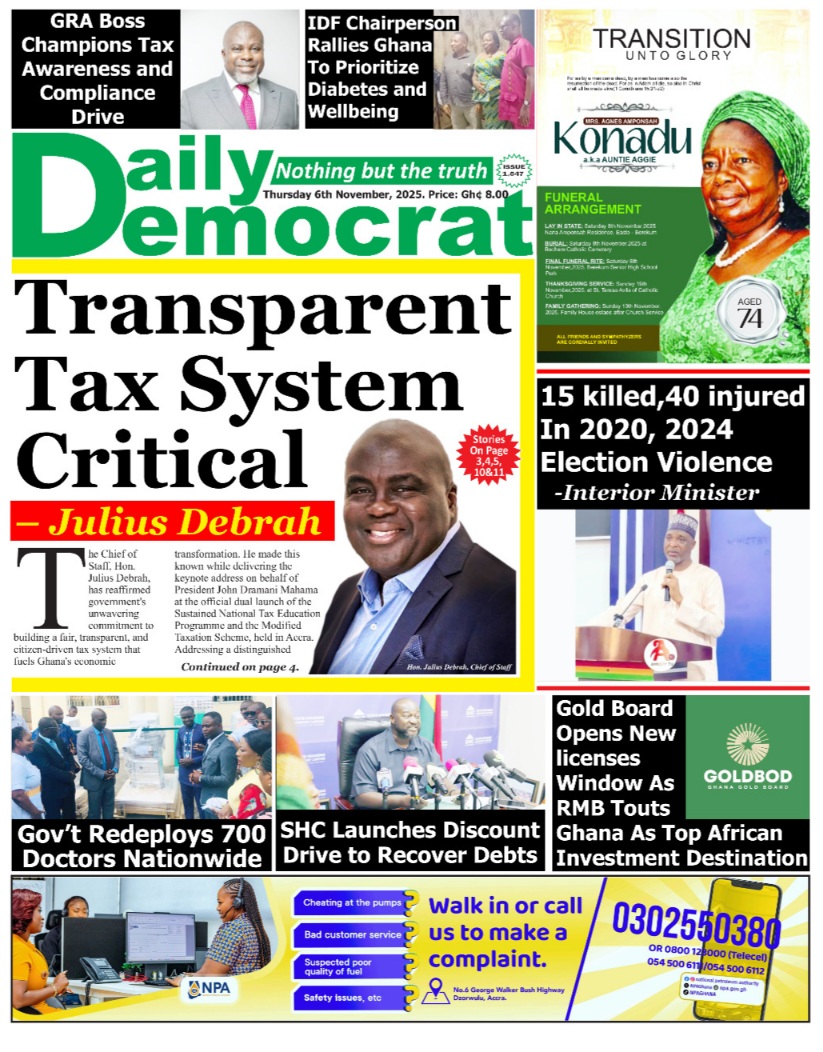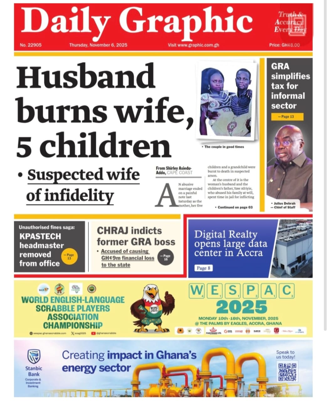 NEWS Thursday November 6, 2025 Newspapers Front pages By Tolon Radio November 6, 2025 Share Thursday November 6, 2025 Newspapers Front pages SHARE Thursday November 6, 2025 Newspapers Front pages By: Hamza Lansah Lolly ] You Might Also Like Mumin Salifu COP, “Jack Sparrow,” declares bid for NPP Northern Regional Chairmanship Interior Ministry launches nationwide recruitment for security agencies TaMA disbursed funds to support PWDs for economic empowerment and social inclusion 21 suspects identified in election 2020 & 2024 violence that kills 15, injured 40 – Interior Minister Mayor Abu Takoro paid working visit to the newly constructed Bilpiela Abattoir Share This Article Facebook Twitter Email Print Follow USFind US on Social Medias FacebookLikeTwitterFollowInstagramFollowYoutubeSubscribe Popular News POLITICS Minority criticises government plan to channel NHIS funds into politically-branded health scheme Tolon Radio July 24, 2025 Tolon NPP, NDC signs peace pact for peaceful election NPP distances itself from MP’s temarks, reaffirms commitment to National Unity Dr Amin Adam handover Pishigu ICT centre to School Stop complaining, find money, and service Ghana’s debts – Dr Amin Adam to President Mahama TRENDING Thursday November 6, 2025 Newspapers Front pages November 6, 2025 Mumin Salifu COP, “Jack Sparrow,” declares bid for NPP Northern Regional Chairmanship November 5, 2025 Interior Ministry launches nationwide recruitment for security agencies November 5, 2025 TaMA disbursed funds to support PWDs for economic empowerment and social inclusion November 4, 2025 21 suspects identified in election 2020 & 2024 violence that kills 15, injured 40 – Interior Minister November 4, 2025