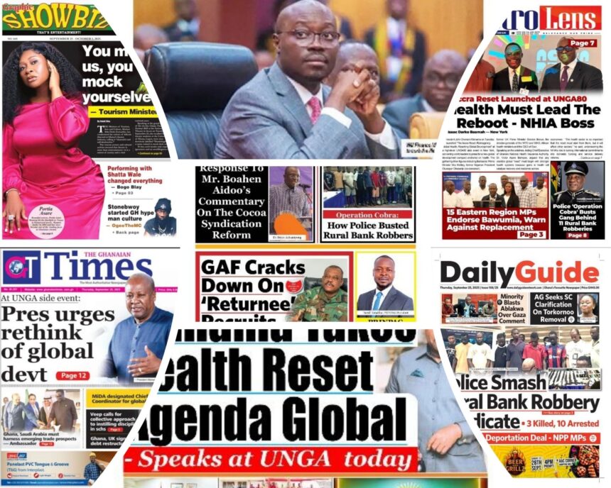 NEWS Thursday September 25 2025 Newspaper Headlines By Tolon Radio September 25, 2025 Share Thursday September 25 2025 Newspaper Headlines SHARE Thursday September 25 2025 Newspaper Headlines By: Hamza Lansah Lolly You Might Also Like Wednesday,October 1, 2025 Newspaper Headlines Newspaper Headlines – Tuesday, 30th September, 2025 Newspaper Headlines, Monday, 29th September, 2025 Dr Mohammed Amin Adam criticises Mahama’s leadership despite UNGA powerful address Full text: Mahama’s address at the 80th United Nations General Assembly meeting Share This Article Facebook Twitter Email Print Follow USFind US on Social Medias FacebookLikeTwitterFollowInstagramFollowYoutubeSubscribe Popular News NEWS Plane Crash: 3 crew members, 5 passengers on missing helicopter – Ghana Armed Forces Tolon Radio August 6, 2025 Farouk Aliu Mahama to go unopposed in an upcoming NPP Parliamentary primaries? Jake Paul beats Mike Tyson in unanimous decision Breaking News: Ibrahim Engineer bow out of NDC Tamale Central primary Minority criticises government plan to channel NHIS funds into politically-branded health scheme TRENDING Wednesday,October 1, 2025 Newspaper Headlines October 1, 2025 Newspaper Headlines – Tuesday, 30th September, 2025 September 30, 2025 Newspaper Headlines, Monday, 29th September, 2025 September 29, 2025 At least 39 dead in crush at political rally in India September 28, 2025 Dr Mohammed Amin Adam criticises Mahama’s leadership despite UNGA powerful address September 25, 2025