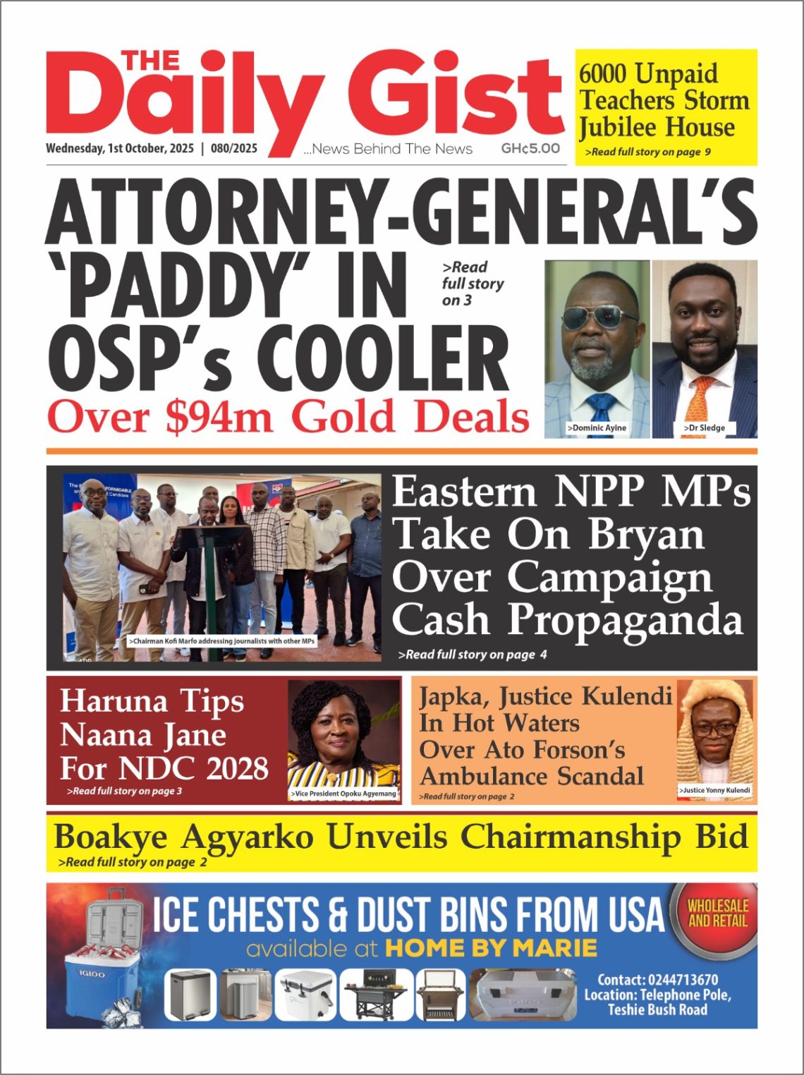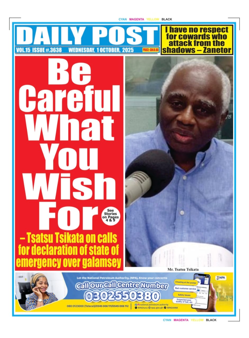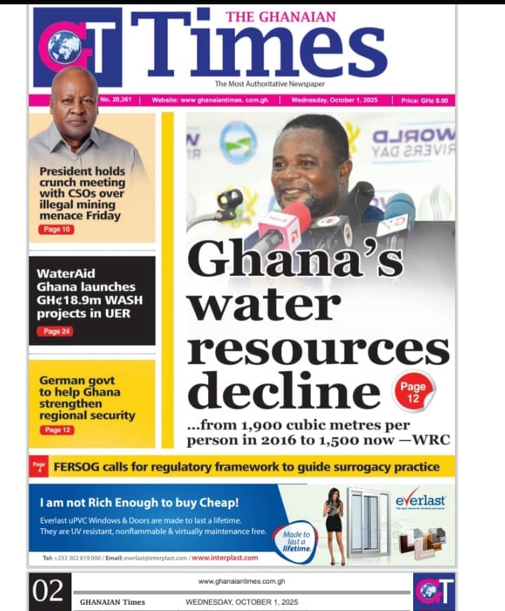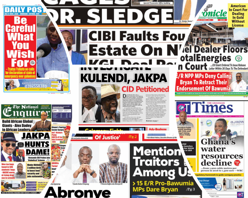 NEWS Wednesday,October 1, 2025 Newspaper Headlines By Tolon Radio October 1, 2025 Share Tuesday, September 30, 2025 Newspaper Headlines SHARE By: Hamza Lansah Lolly Wednesday,October 1, 2025 Newspaper Headlines You Might Also Like Newspaper Headlines – Tuesday, 30th September, 2025 Newspaper Headlines, Monday, 29th September, 2025 Dr Mohammed Amin Adam criticises Mahama’s leadership despite UNGA powerful address Full text: Mahama’s address at the 80th United Nations General Assembly meeting Thursday September 25 2025 Newspaper Headlines Share This Article Facebook Twitter Email Print Follow USFind US on Social Medias FacebookLikeTwitterFollowInstagramFollowYoutubeSubscribe Popular News NEWS Northern Regional Peace Council seeks collaboration with Minister to strengthen peace efforts Tolon Radio February 21, 2025 Ghana earns over $1.1 Billion from Gold Export in one Month under New Goldbod initiative Erik ten Hag sacked by Manchester United 447,698 students gain automatic admission as 2024 school placement results are released Salam Mustapha labels John Mahama as a reckless speaker, hails Dr. Bawumia as a unifier TRENDING Wednesday,October 1, 2025 Newspaper Headlines October 1, 2025 Newspaper Headlines – Tuesday, 30th September, 2025 September 30, 2025 Newspaper Headlines, Monday, 29th September, 2025 September 29, 2025 At least 39 dead in crush at political rally in India September 28, 2025 Dr Mohammed Amin Adam criticises Mahama’s leadership despite UNGA powerful address September 25, 2025